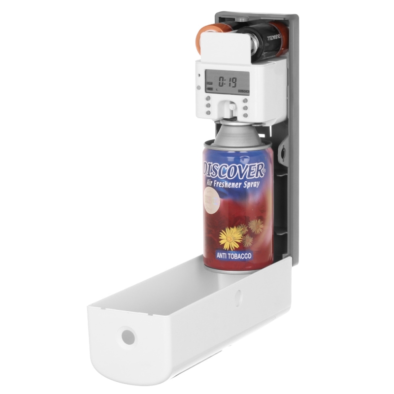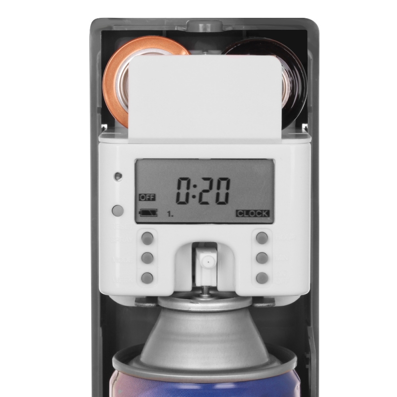 Корпус ароматизатора закрывается на ключ для предотвращения хищений баллонов с освежителем воздуха и батареек. Работа от батареек делает устройство независимым от наличия электроподключения в помещении, а небольшие размеры и вес позволяют установить освежитель в любом месте.