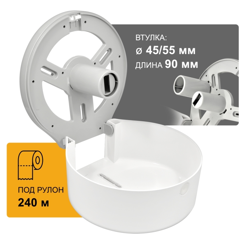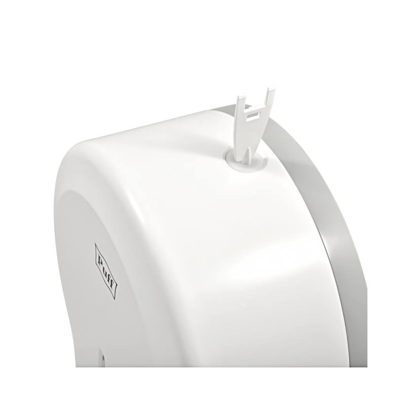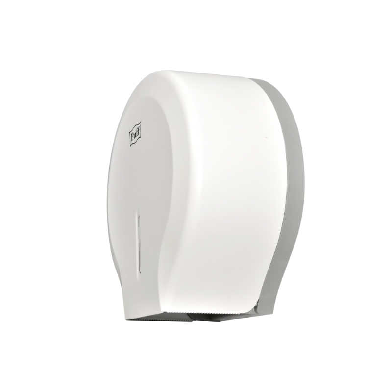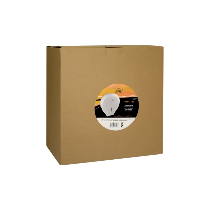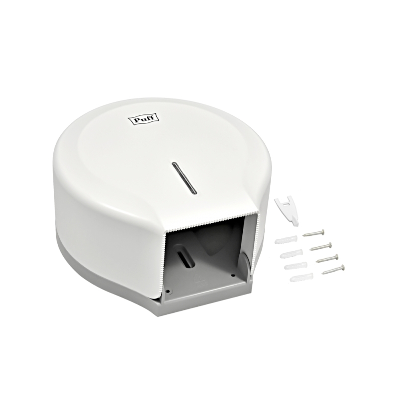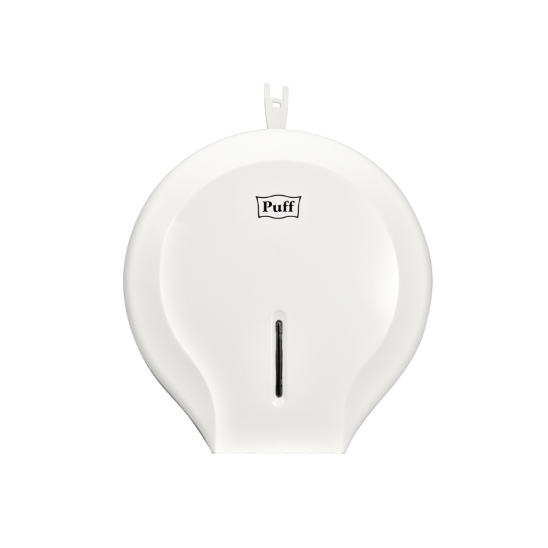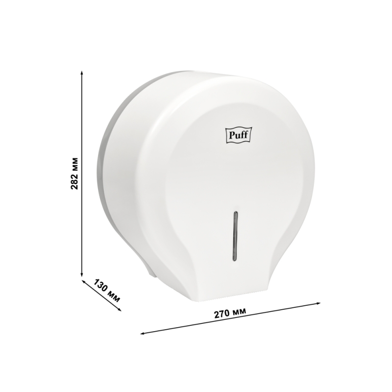 Диспенсер для туалетной бумаги Рuff-7130. Диспенсер изготовлен из ударопрочного пластика белого цвета с матовой поверхностью. Диспенсер используется с рулонной туалетной бумагой диаметром до 220 мм. Корпус оборудован ключом.