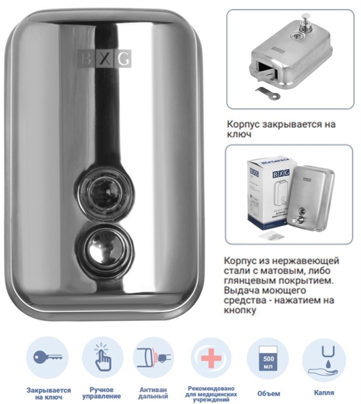 Дозатор для мыла BXG-SD-H1-500- наливной, антивандальный дозатор. Используется для жидкого мыла, шампуня или геля. Надежный дозирующий клапан. Закрывается на ключ. В комплект входят все элементы крепления. Современный дизайн.
