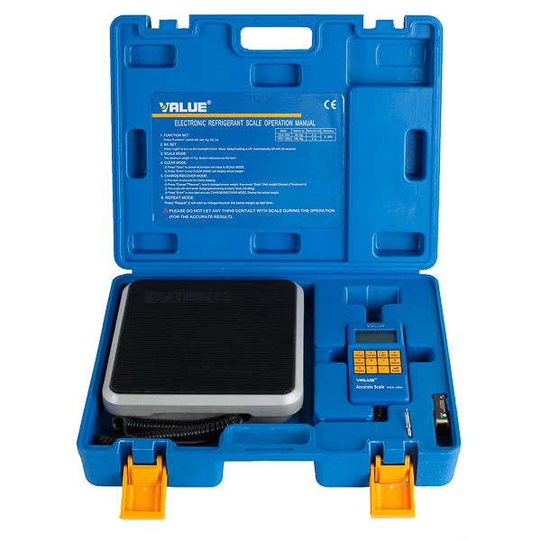 Весы электронные для хладагента Value Ves-50A обладают прочной конструкцией и оснащены большой платформой для больших емкостей с хладоном. Поставляются в пластиковом кейсе. Для работы весы нужно вынуть из кейса и установить на ровную поверхность.