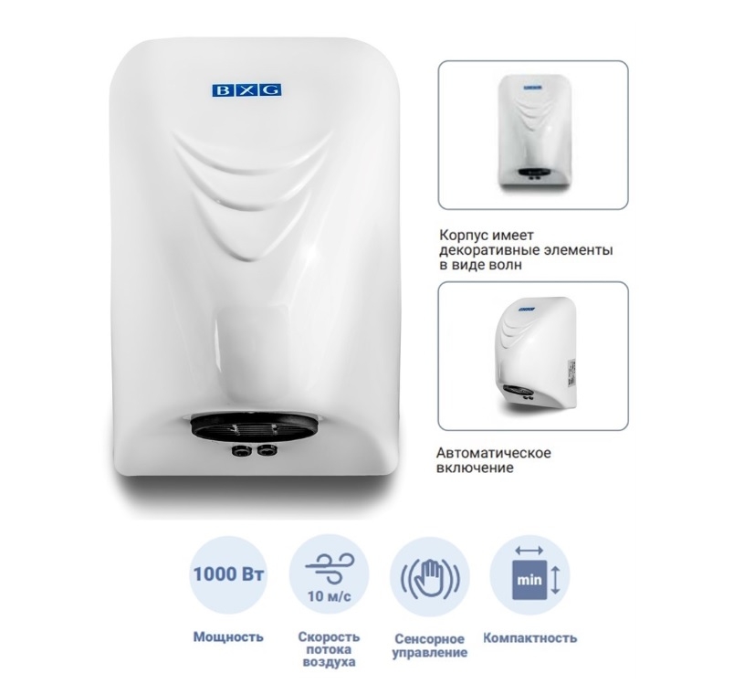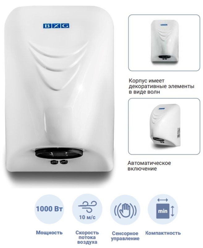 BXG-100 - малошумный электросушитель для рук. Компактный, надежный, простой в использовании. Автоматическое отключение (при непрерывной работе сушилка автоматически отключится через 60 секунд). Есть функция защиты от перегрева. Автоматическое включение/отключение.