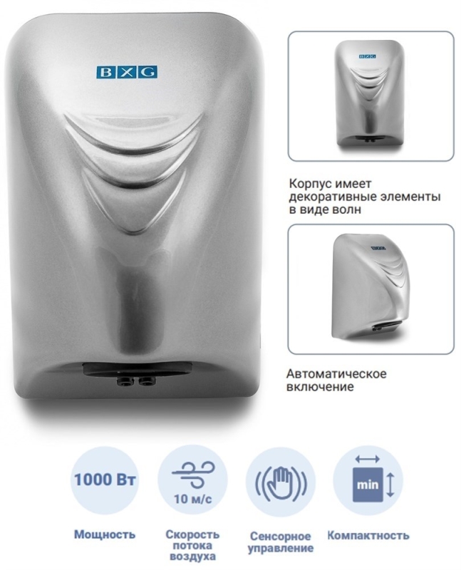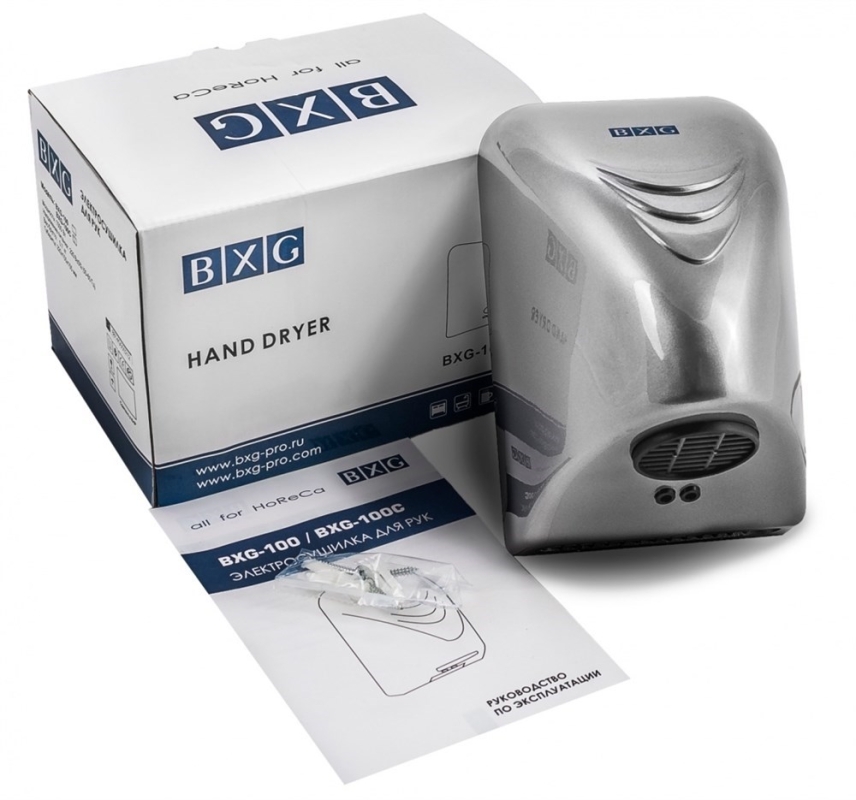 Электросушилка для рук BXG 100 С имеет мощность 1 кВт. Изделие позволяет высушить руки за 12-20 секунд. Удобно использовать в туалетах общего пользования, кафе, гостиницах и т.д. Прибор имеет функцию защиты от перегрева, сушилка автоматически отключится если температура потока воздуха достигнет 105°С.