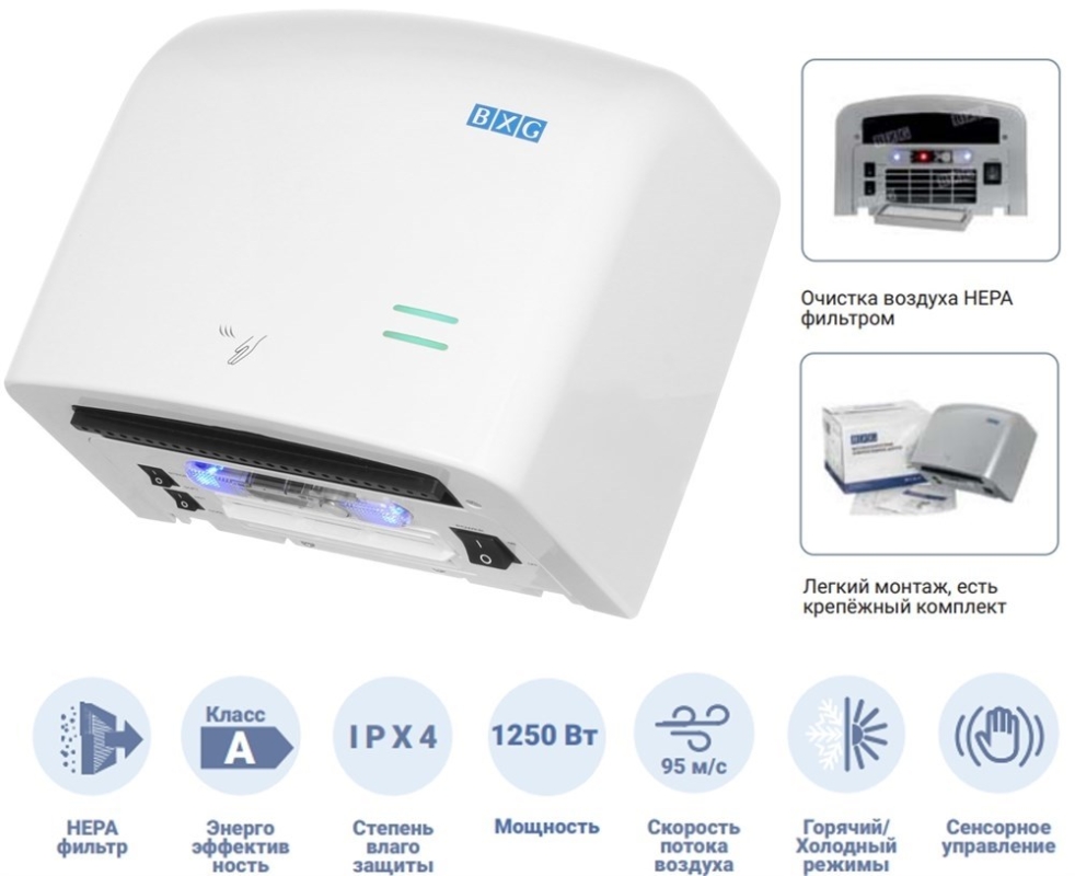 Электросушилка для рук BXG JET 5500 выполнена из высококачественного ABS-пластика, который отличается устойчивостью к физическому и химическому воздействию. Благодаря выпускному отверстию продолговатой формы возможна сушка всей поверхности руки от локтя до кончиков пальцев.