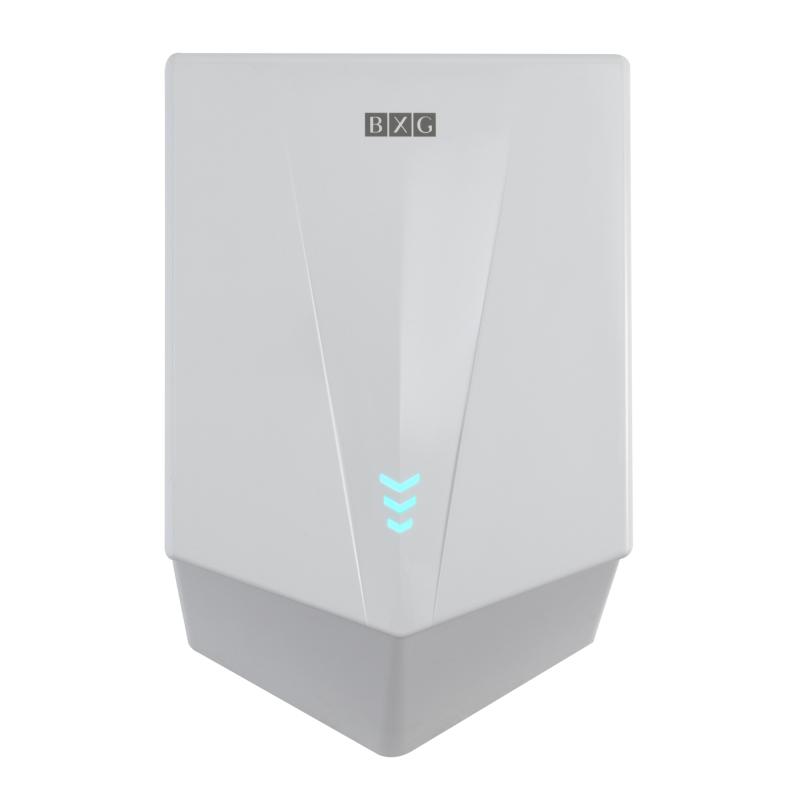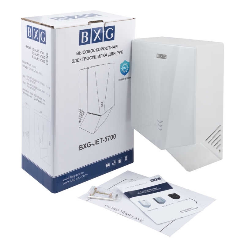 BXG-JET-5700 – Высокоскоростная электросушилка сушилка для рук нового поколения с функцией Ультрафиолетового обеззараживания. Сушилка выполнена из высокопрочного пластика ABS в благородном белом цвете.