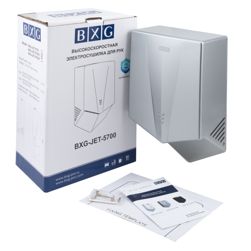 BXG-JET-5700С – Высокоскоростная электросушилка сушилка для рук нового поколения с функцией Ультрафиолетового обеззараживания. Сушилка выполнена из высокопрочного пластика ABS в благородном цвете хром.
