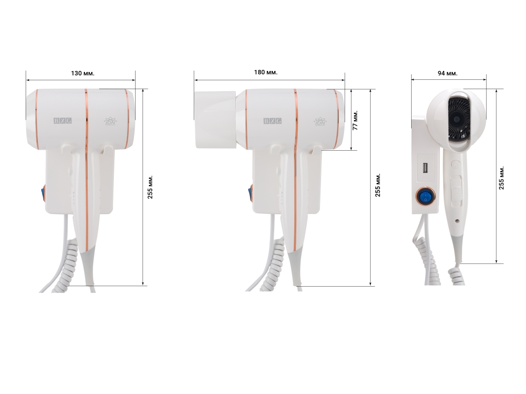 BXG-1600Н1 оснащён функцией автоматического отключения на случай перегрева, короткого замыкания или скачков напряжения в электросети, а также системой блокировки работы фена при размещение его на настенном держателе – фен отключится автоматически.