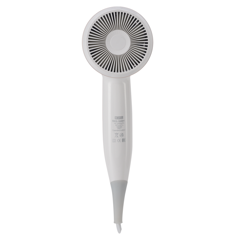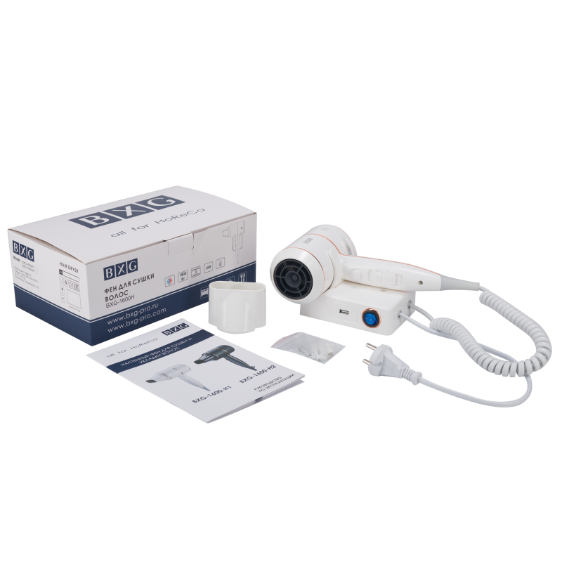 BXG-1600 H1 - фен для волос, предназначенный для использования в гостиницах, жилых помещениях и проч. Обладает двумя режимами подачи воздуха (холодный и горячий), а также двумя скоростями потока воздуха.