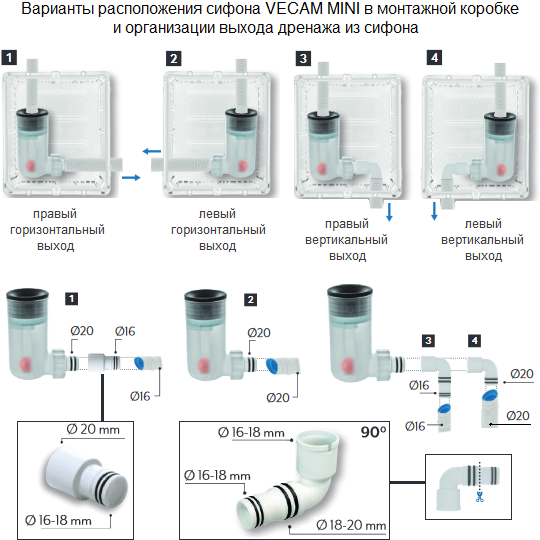 Сифон Vecam Mini позволяет контролировать его работу и обладает следующими характеристиками: