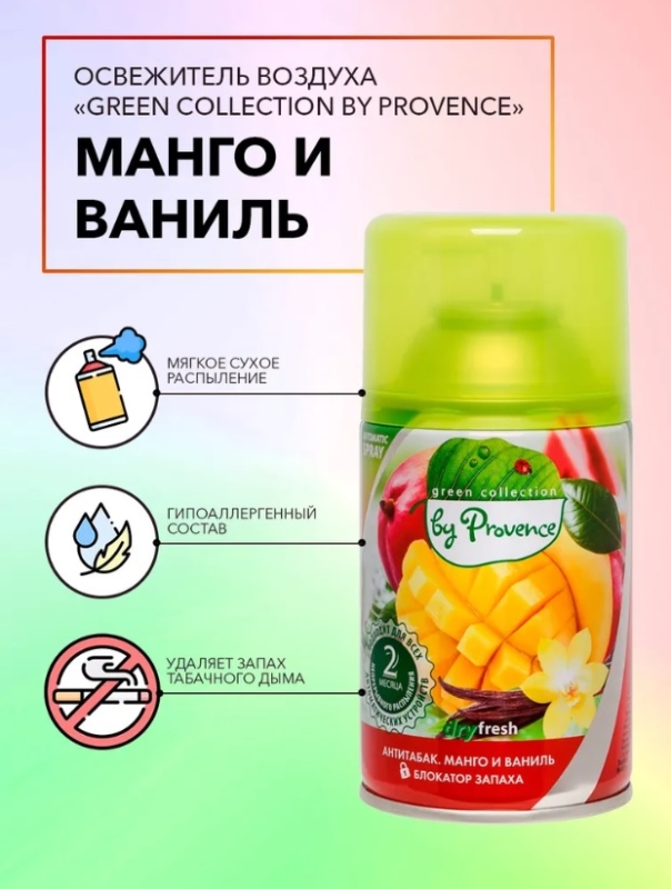 "Сухое распыление" не оставляет следов на кафельной плитке, потолке, обоях, гардинах и мебели. Гипоаллергенный состав сменного баллона с формулой "сухое распыление" подтверждён Институтом Иммунологии. Вы можете поддерживать аромат чистоты и свежести дома без вреда для здоровья. Обладает ярко выраженным действием против запаха табачного дыма.