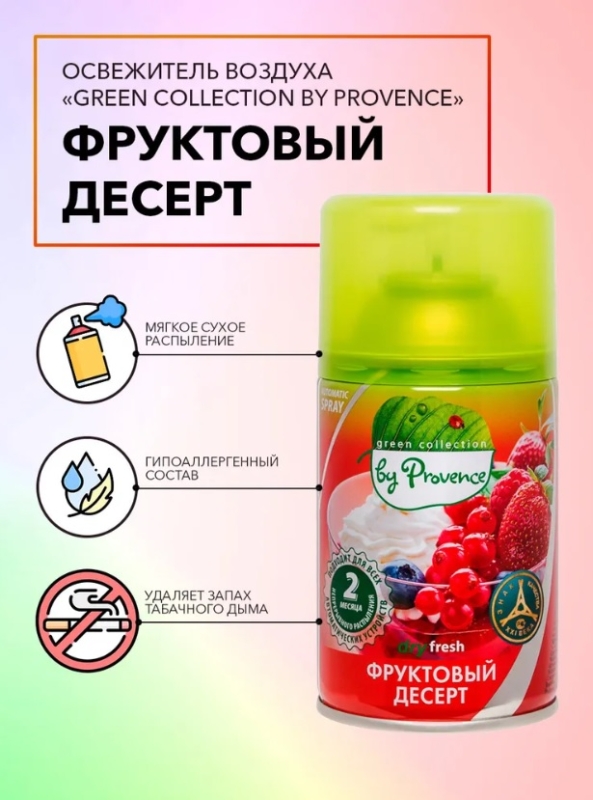 "Сухое распыление" не оставляет следов на кафельной плитке, потолке, обоях, гардинах и мебели. Гипоаллергенный состав сменного баллона с формулой "сухое распыление" подтверждён Институтом Иммунологии. Вы можете поддерживать аромат чистоты и свежести дома без вреда для здоровья. Обладает ярко выраженным действием против запаха табачного дыма.