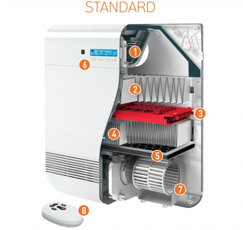 Фильтр F7. Предустановлен во всех бризерах. Задерживает пух, шерсть, крупные и средние частицы пыли, пыльцы и другие загрязнители. Частота замены — 1 раз в полгода.