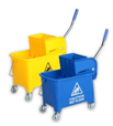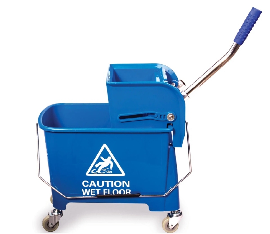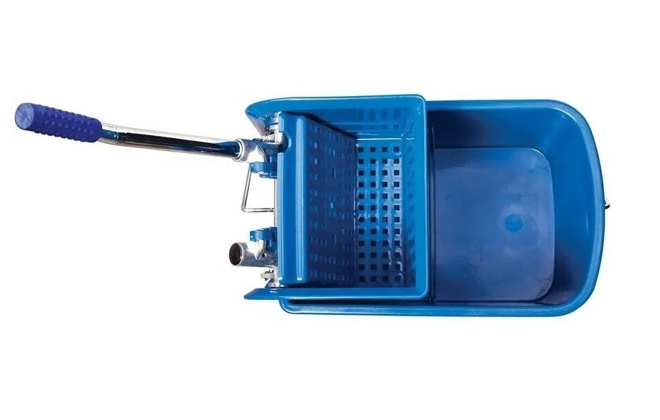 Синее ведро на колесах для уборки помещений. Ведро отлито из прочного пластика оснащено металлической ручкой для переноски. Конструкция оснащена колесиками на ножках, что позволяет без труда перемещать даже максимально наполненно ведро, не расплескивая при этом воду. Механический отжим значительно облегчает работу.
