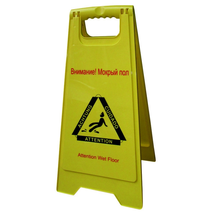 Знак "Мокрый пол" FP-117P — напольная панель, предупреждающая об опасности подскользнуться на скользких поверхностях. Изготовлена из пластика, надпись на русском языке. Легкая и компактная система визуального предупреждения.