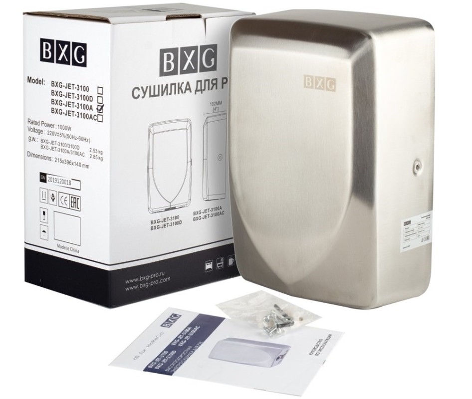 Безопасность. BXG-JET-3100 UV обладает самым высоким классом влагозащиты IPX4 (исключено попадание влаги вовнутрь устройства со всех сторон) и возможность короткого замыкания или удара электрическим током при правильной эксплуатации исключена.. Благодаря ИК-датчикам и технологии микропроцессорного управления осуществляется независимый контроль, который предотвращает слишком долгое использование сушилки или использование не по назначению. Прибор оснащён устройством автоматического отключения на случай перегрева, короткого замыкания или скачков напряжения в электросети.