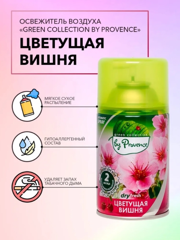 "Сухое распыление" не оставляет следов на кафельной плитке, потолке, обоях, гардинах и мебели. Гипоаллергенный состав сменного баллона с формулой "сухое распыление" подтверждён Институтом Иммунологии. Вы можете поддерживать аромат чистоты и свежести дома без вреда для здоровья. Обладает ярко выраженным действием против запаха табачного дыма.